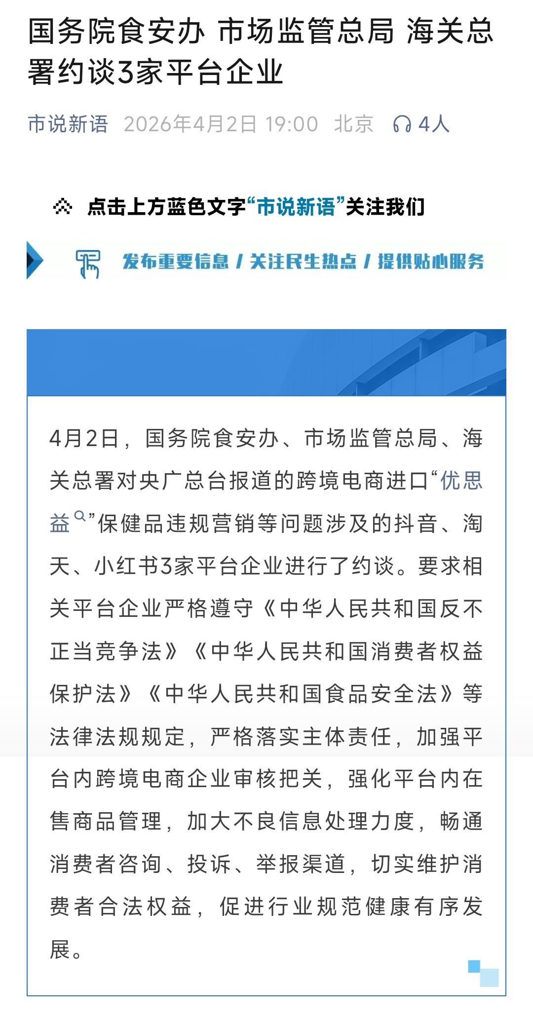 4月2日,亚洲一区二区+在线播放国务院食安办、市场监管总局、海关总署还对相关电商平台进行了约谈。要求平台企业严格遵守《中华人民共和国反不正当竞争法》《中华人民共和国消费者权益保护法》《中华人民共和国食品安全法》等法律法规规定,严格落实主体责任,加强平台内跨境电商企业审核把关,强化平台内在售商品管理,加大不良信息处理力度,畅通消费者咨询、投诉、举报渠道,切实维护消费者合法权益,促进行业规范健康有序发展。此前,广东市场监管、海关、公安三部门对“优思益”品牌所属的广州雅拉源健康产业有限公司已经展开联合调查,浙江杭州市场监管部门对索象公司展开调查。