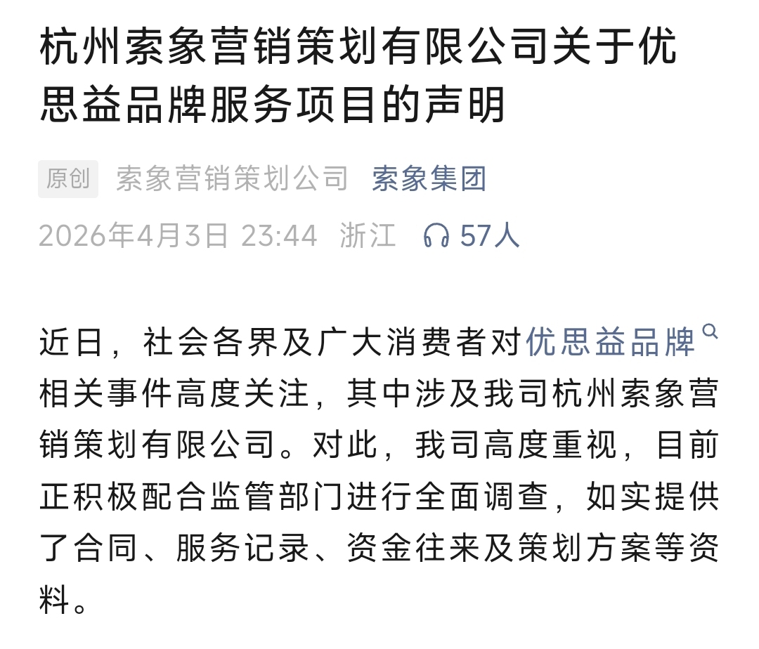 在声明中索象公司郑重澄清:品牌方未委托索象公司寻找澳洲大学教授、医学博士进行背书;亦未委托其进行相关国际奖项的申请及“包装”工作。索象公司相关人员的不当言论,是销售过程中的不严谨的夸大表述,并非事实。“但我司绝无任何诋毁优思益品牌方或故意传播不实信息的主观意图。对此不当言论造成的误解和不良影响,我司诚恳道歉。”